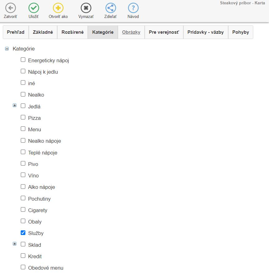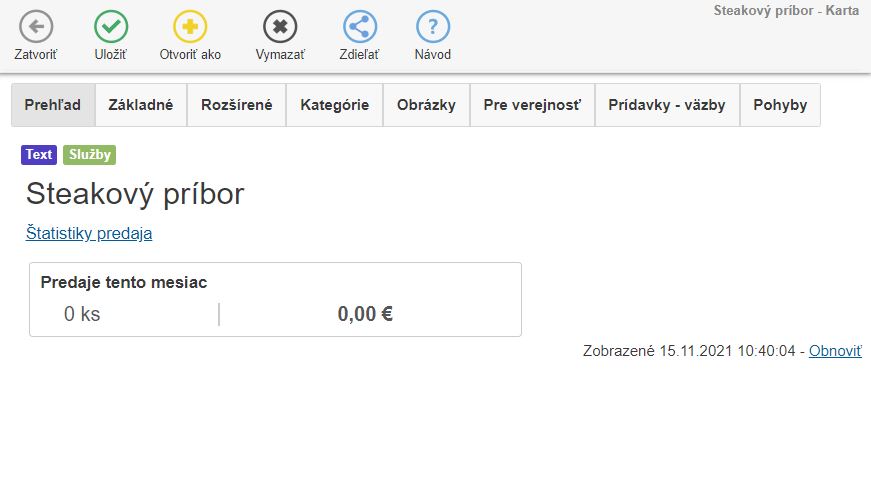 - Je možné na nej viazať položky ako suroviny, to znamená, že pri predaji sa odpíše tovar z naviazaných kariet (surovín).
