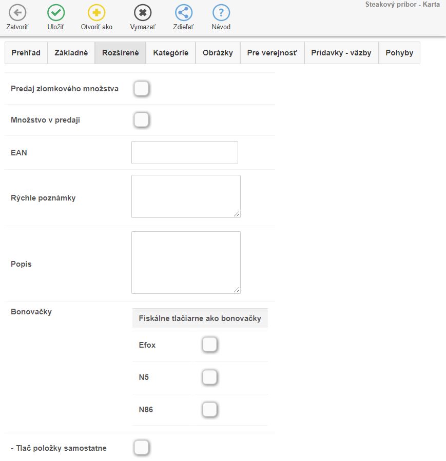 - Možnosť nastavenia zobrazenia na fiskálnom doklade. (Ak sa položka použije v objednávke, či sa aj následne tlačí na doklade.)