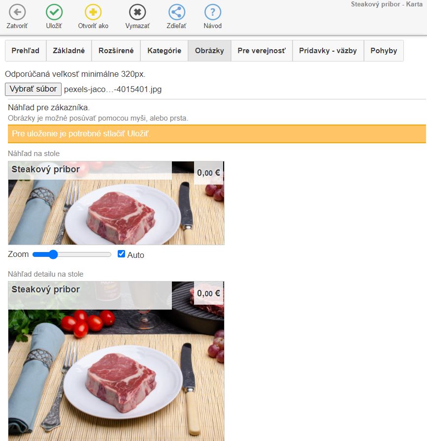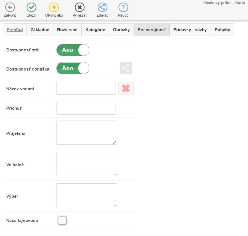 - Na karte je možné definovať zobrazenie v ponuke pre zákazníkov (online objednávanie / inteligentný stôl).