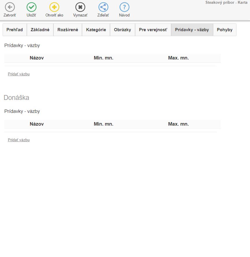 - Naviazanie kariet s ich odpisom zo skladu. Je možné na karte nastaviť viazané karty, alebo suroviny, pričom cez väzbu sa následne v nastavenom množstve odpíšu zo skladu.