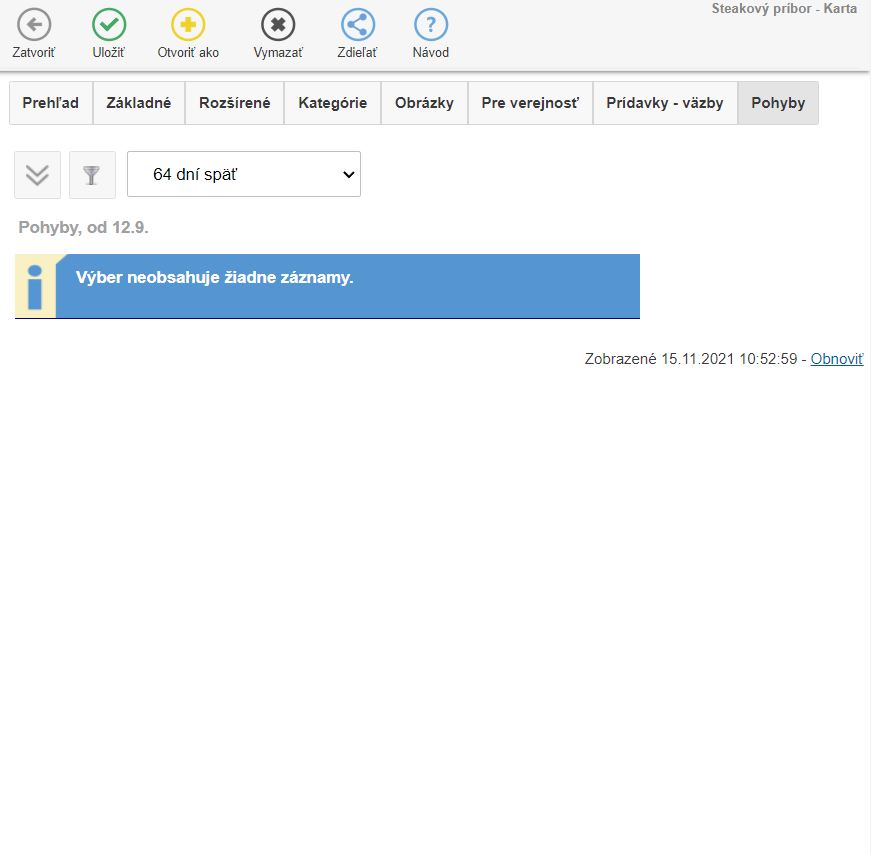 - Pohyby - záložka sa na skladovej karte zobrazuje až v prípade, že je karta už vytvorená a upravovaná. Ak na skladovej karte už bol vykonaný pohyb, predaj, prípadne pri kartách zo skladovou evidenciou príjem zobrazí sa táto záložka. Ďalšie informácie o údajoch zobrazených na tejto záložke sa dozviete v návode Skladová karta - záložka Pohyby.