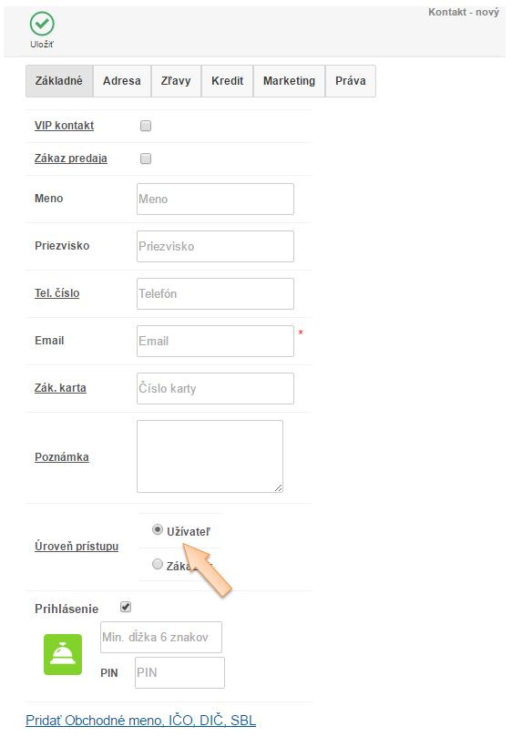Úroveň prístupu - nastavenie definuje, či sa nový kontakt bude v systéme zakladať ako užívateľ alebo zákazník. Od daného nastavenia sa následne odvíjajú aj ďalšie možnosti v aplikácii.
