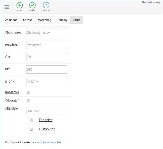 Pridať obchodné meno, IČO, DIČ, SBL - v prípade, že kontakt ktorý evidujete je firma s platnými obchodnými údajmi, po kliknutí na tlačidlo sa zobrazí ďalšia záložka Firma, kde je možné tieto údaje vyplniť.