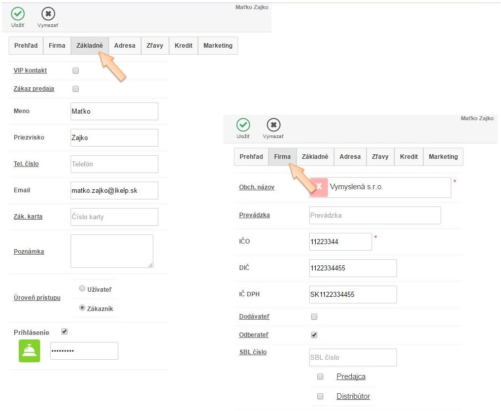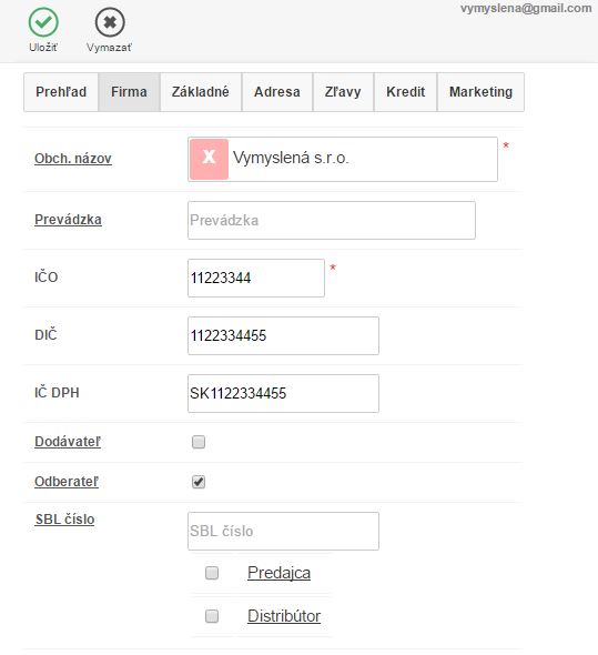 - Na danom kontakte zákazníka vyplniť údaje o firme kliknutím na tlačidlo Pridať Obchodné meno, IČO, DIČ, SBL v záložke Základné.