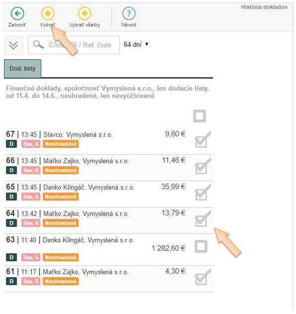 - Kliknutím na tlačidlo +Vybrať potvrdíte výber označených dokladov. Kliknutím na +Vybrať všetky sa automaticky na faktúru pridajú všetky doklady zo zoznamu.