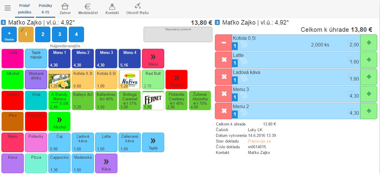 - Na jednom stole môžete mať aj viacero dokladov, takže ak pri stole sedí viacero zákazníkov a potrebujete jednotlivé položky objednávky rozdeľovať na konkrétnych zákazníkov, je to možné.