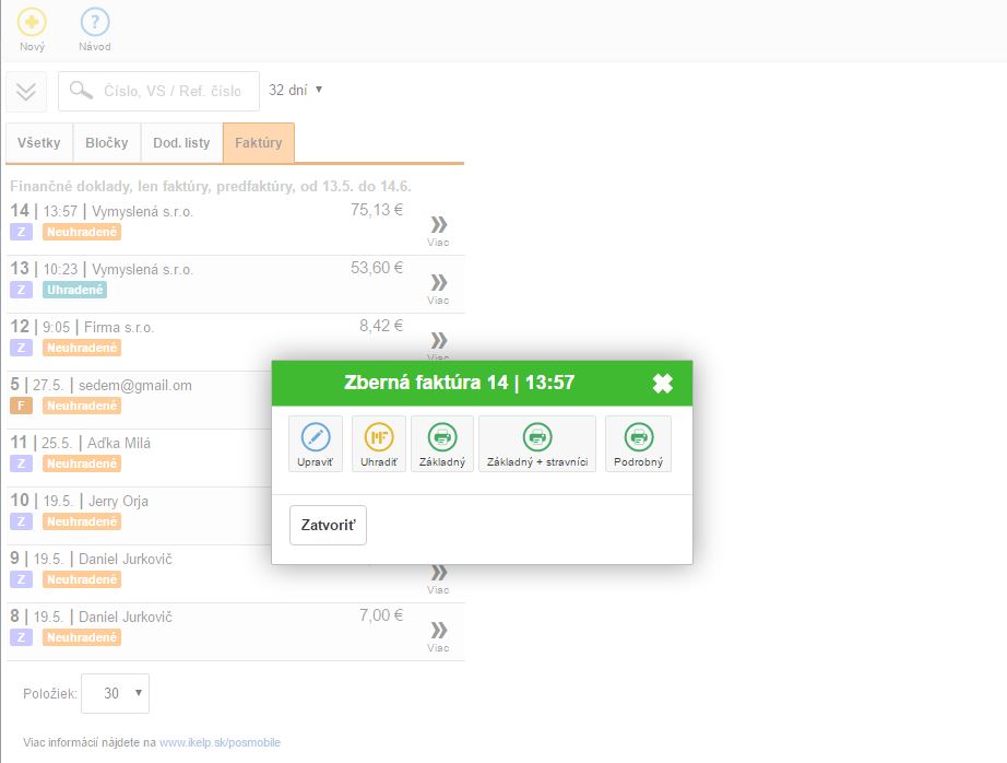 - Podrobný - podrobný výstup zbernej faktúry na ktorej sa zobrazuje detailný rozpis položiek rozpísaných na jednotlivých zákazníkov po dňoch.