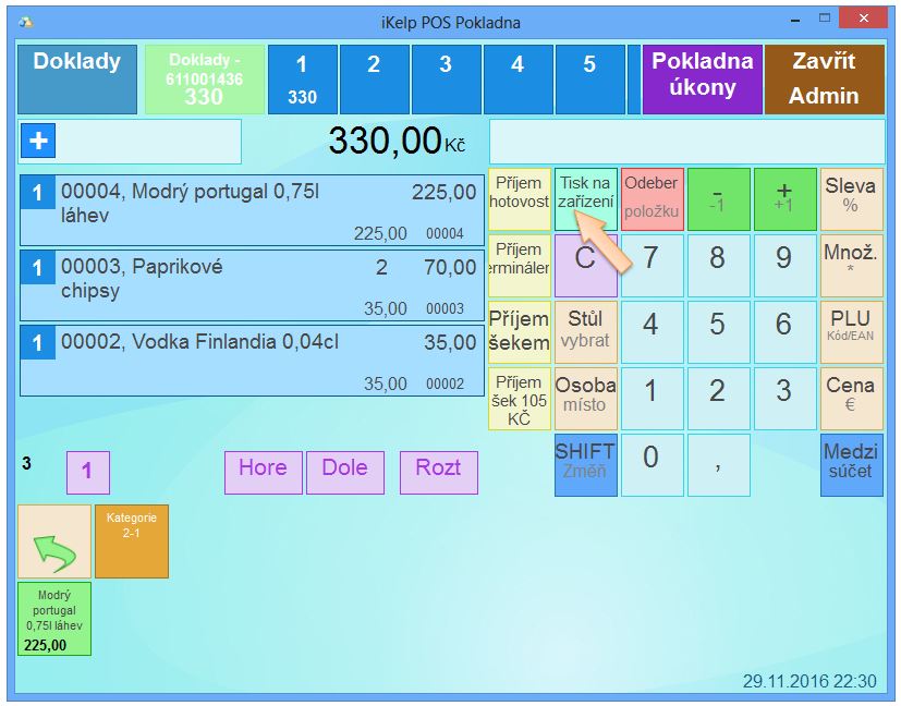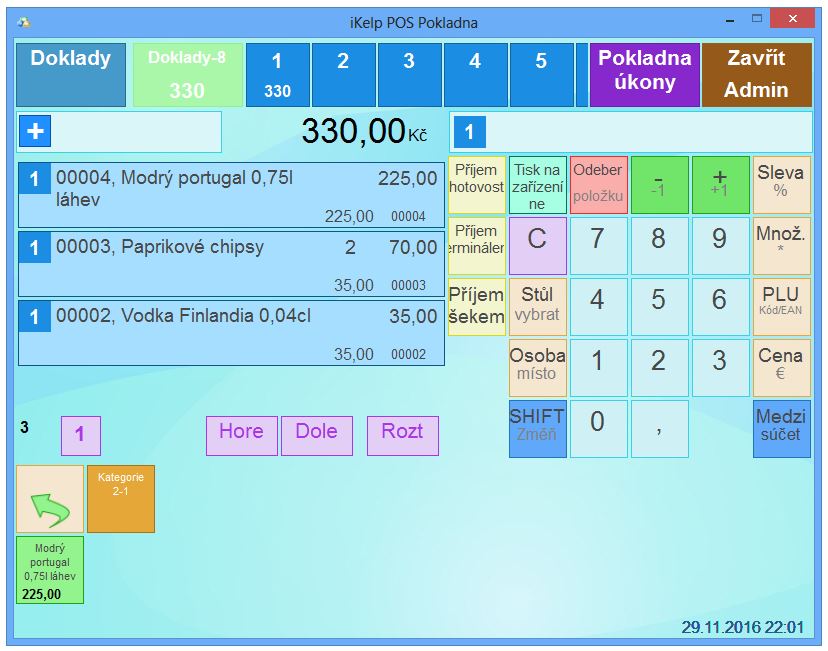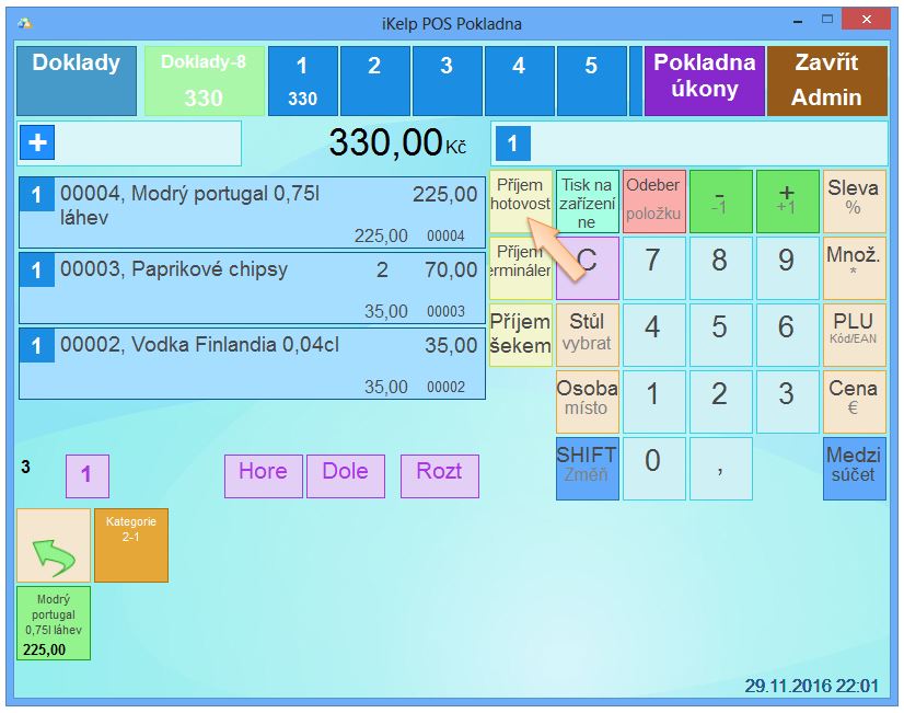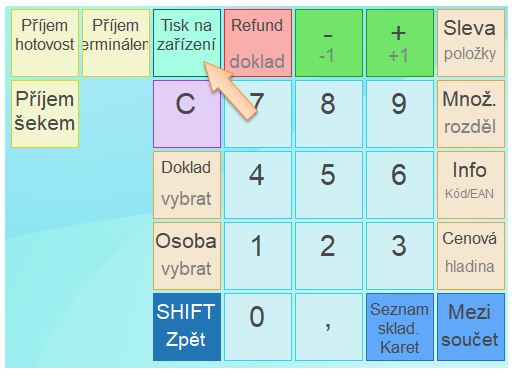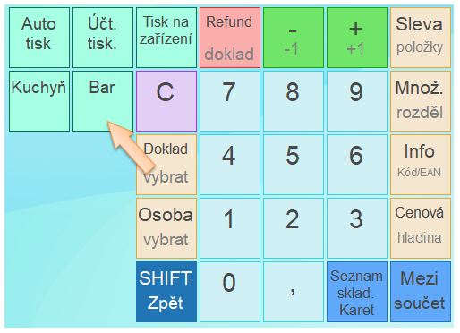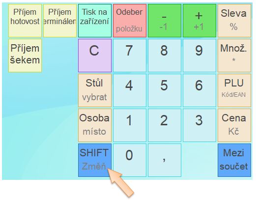 • Stiskněte tlačítko SHIFT změníte význam funkčních tlačítek. (Pokud je tlačítko SHIFT aktivní, vidíte to např. tak, že tlačítko Odeber položku se změní na Refund doklad.)