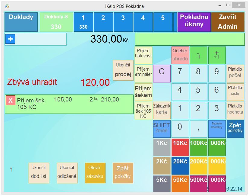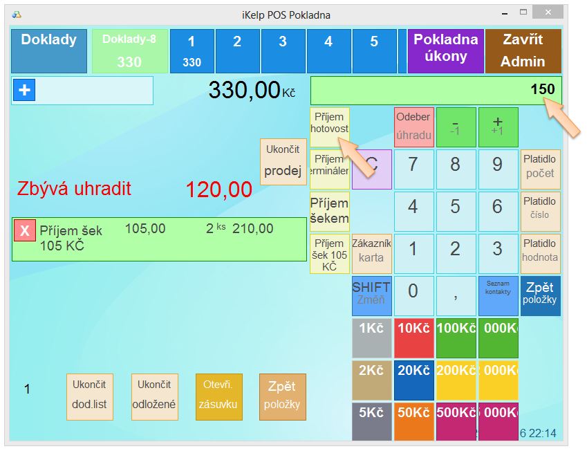 • Stiskněte platidlo šeku hodnoty 105Kč. Pokud vidíte toto tlačítko na obrazovce, stiskněte ho, pokud ho nevidíte, stiskněte tlačítko [SHIFT]. Umístění platidel je možné různě konfigurovat.