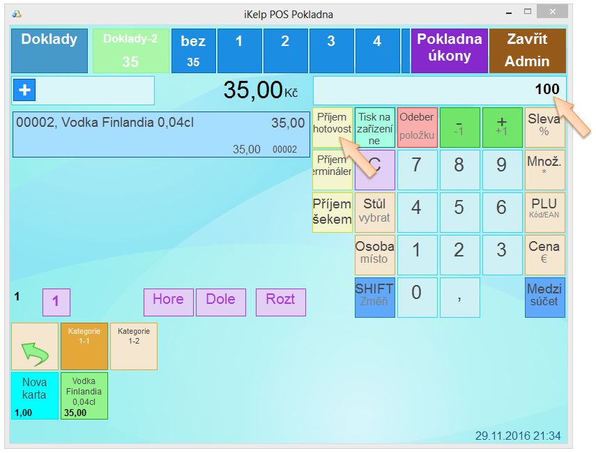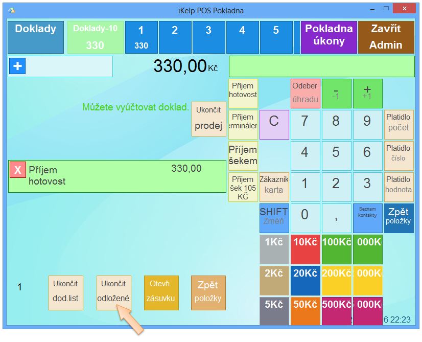 • Pokud zadáte hotovostní sumu větší než je placená suma, prodej se okamžitě ukončí a zobrazí se výdavek.