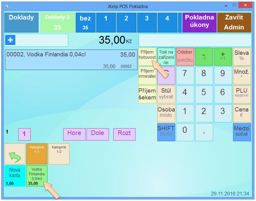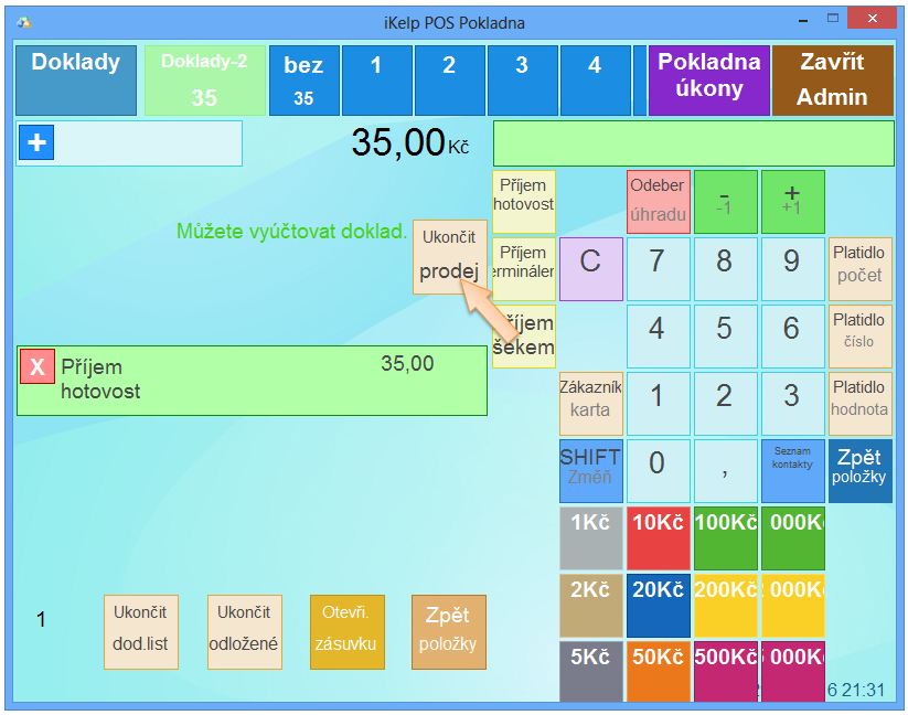 Zákazník platí nákup 35Kč. Zákazník chce zaplatit v hotovosti. Prodej ukončíte následně: