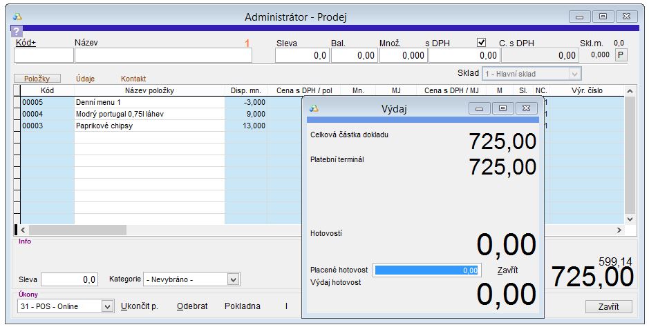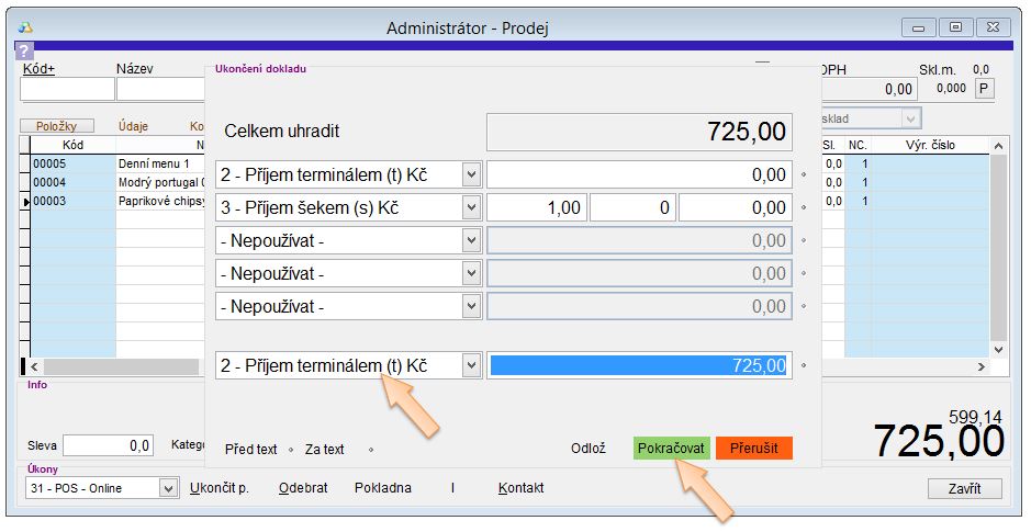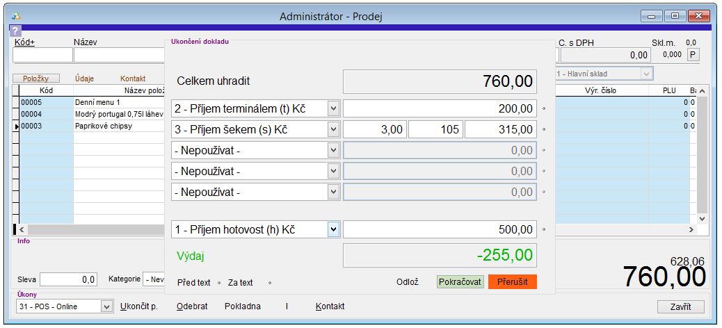 - Prodej nemůžete ukončit, pokud suma definovaných platidel není alespoň taková, jako je suma dokladu.