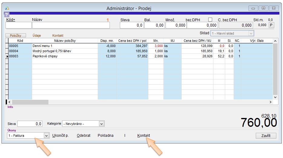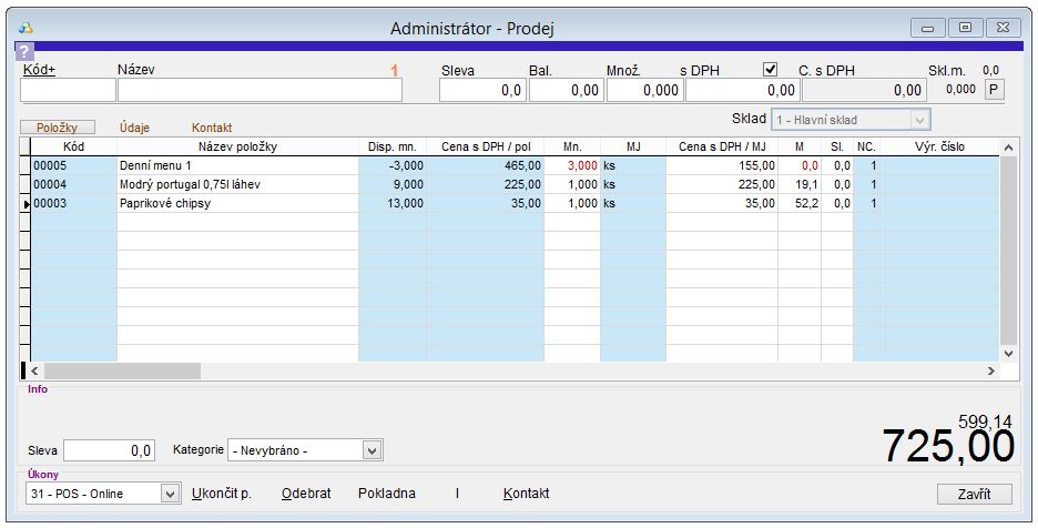 - Do okna Prodej se vyplní položky, které obsahoval vybraný doklad.