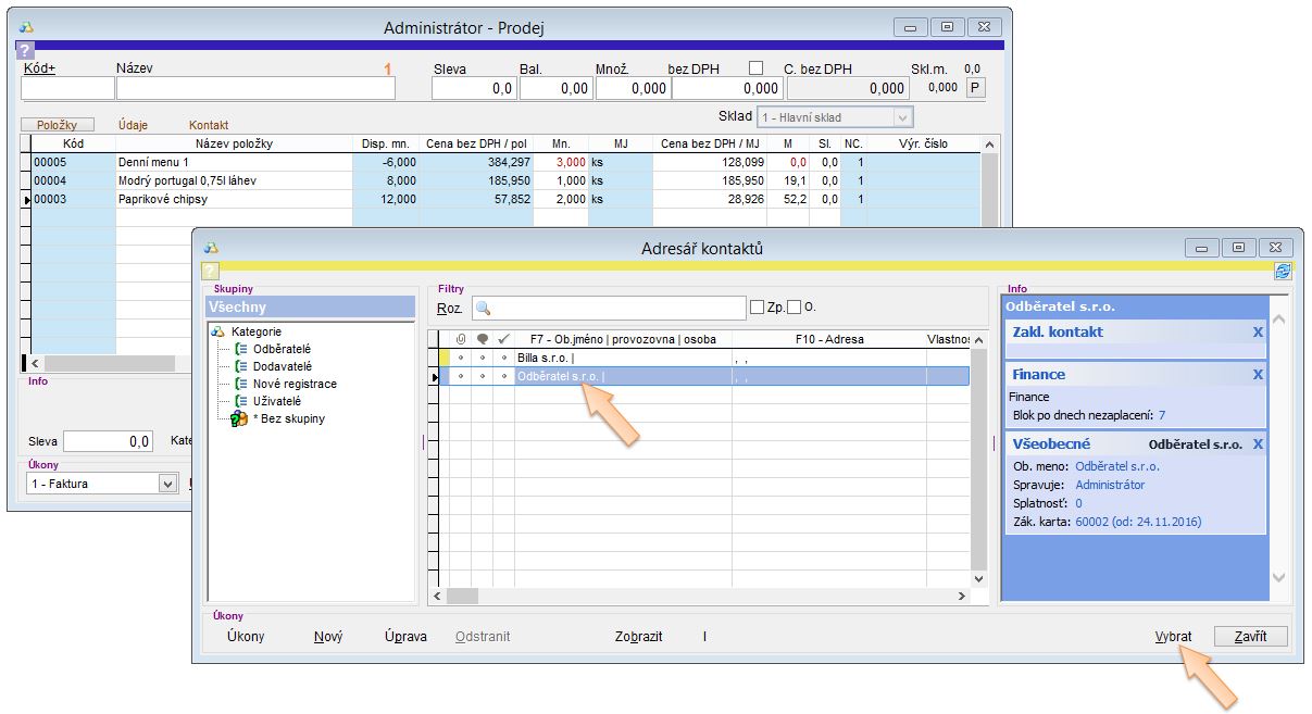 - Vyplňte ručně odběratele v záložce Kontakt, nebo ho vyberte z adresáře stisknutím klávesy F7 (nebo kliknutím na tlačítko Kontakt)