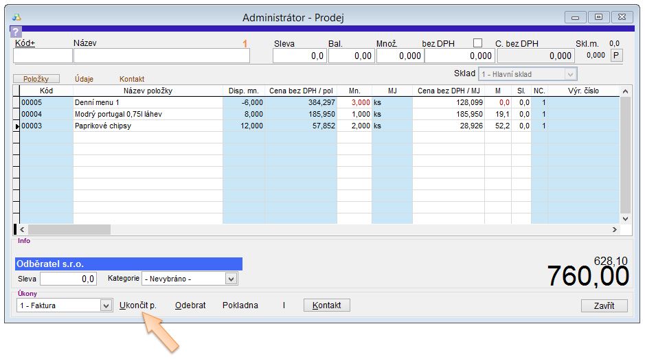 Prodej je možné ukončit dodacím listem a jeho pozdějším vyúčtováním fakturou, účtenkou (hotovostí), nebo přímo ukončením fakturou. Při ukončení prodeje se může mírně lišit cena s DPH v závislosti na typu ukončení, protože se může použít jiný způsob výpočtu.