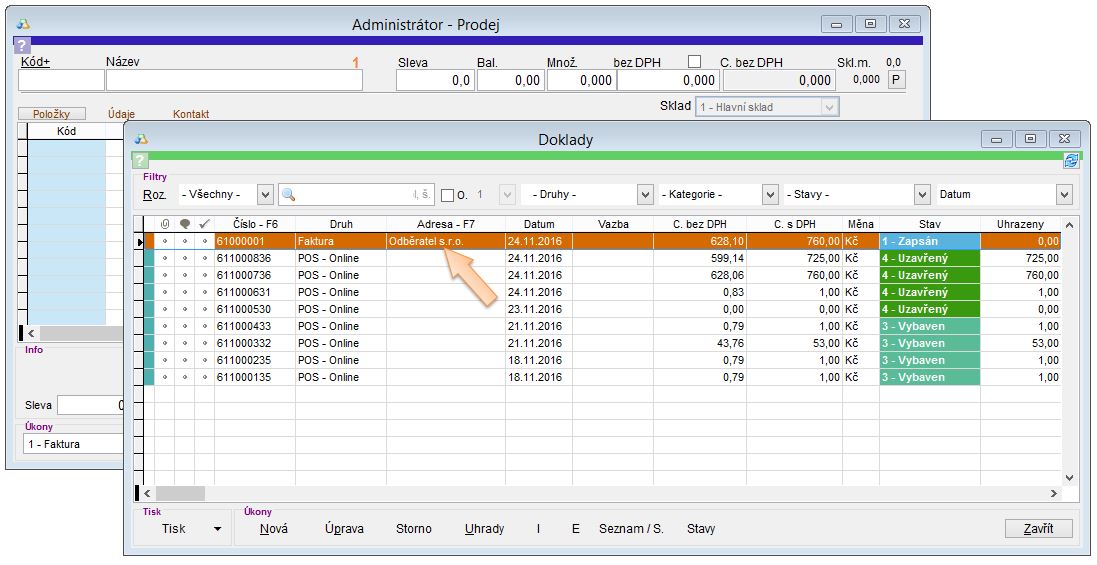 - V okně Prodej stiskněte klávesu F9, kterou zobrazíte okno Doklady, kde je možné vidět všechny vytvořené doklady.