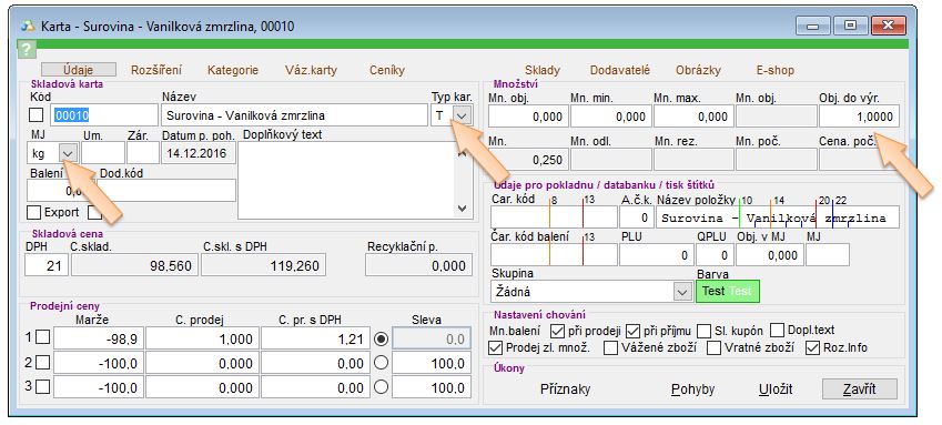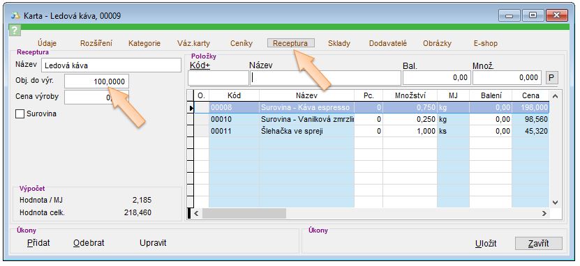 - Obj. do výr. - pro kolik kusů výrobků je daná receptura (například se v restauraci definuje Mn. výroba na 100ks).