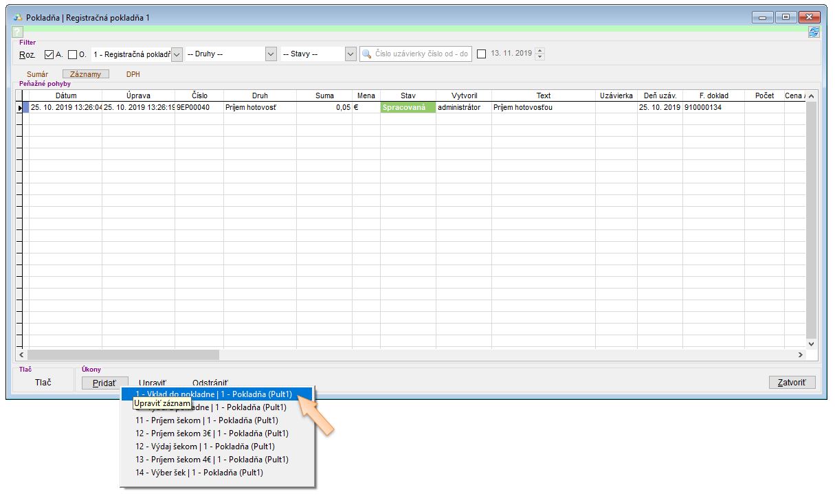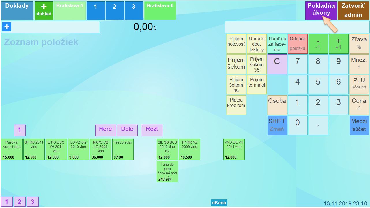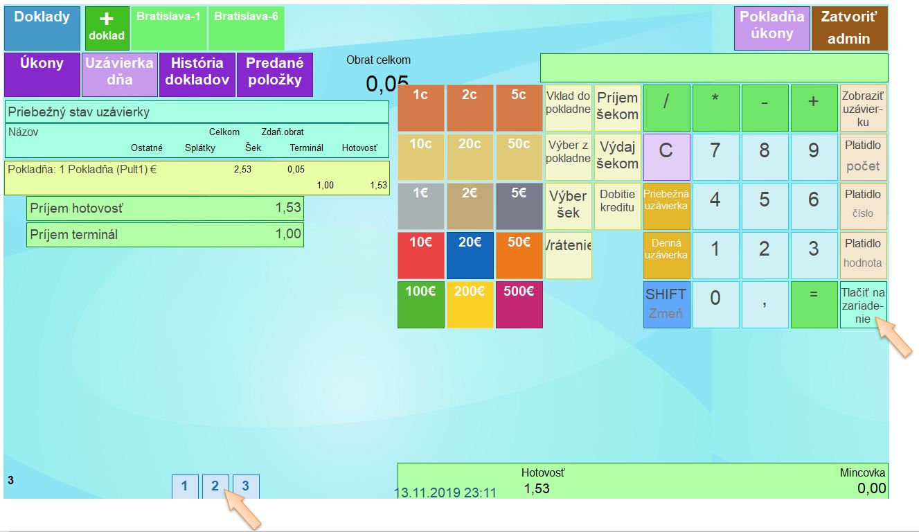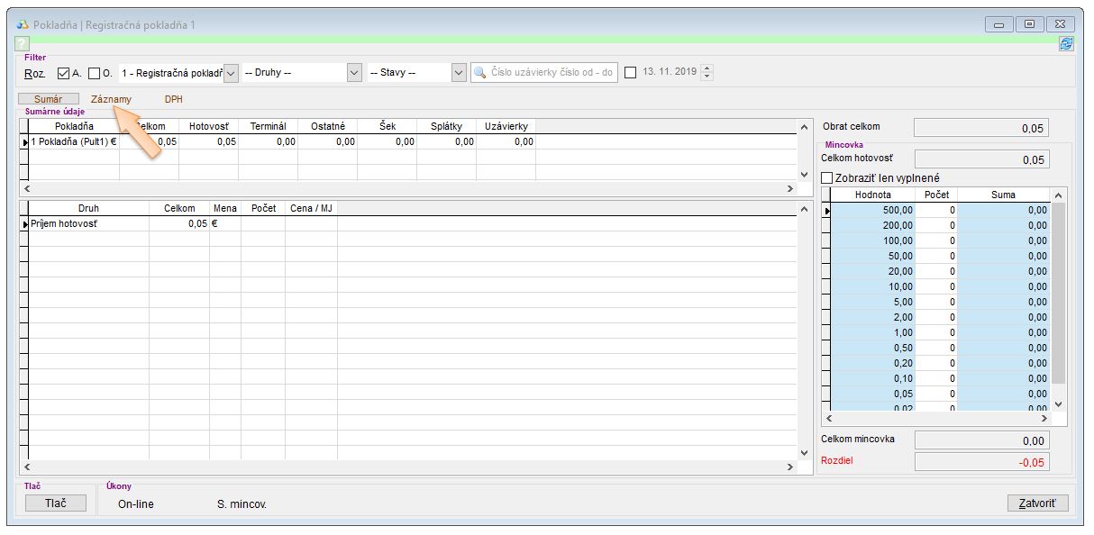 - Reporty sa generujú podľa pokladníc, takže je potrebné zvoliť pokladnicu.
