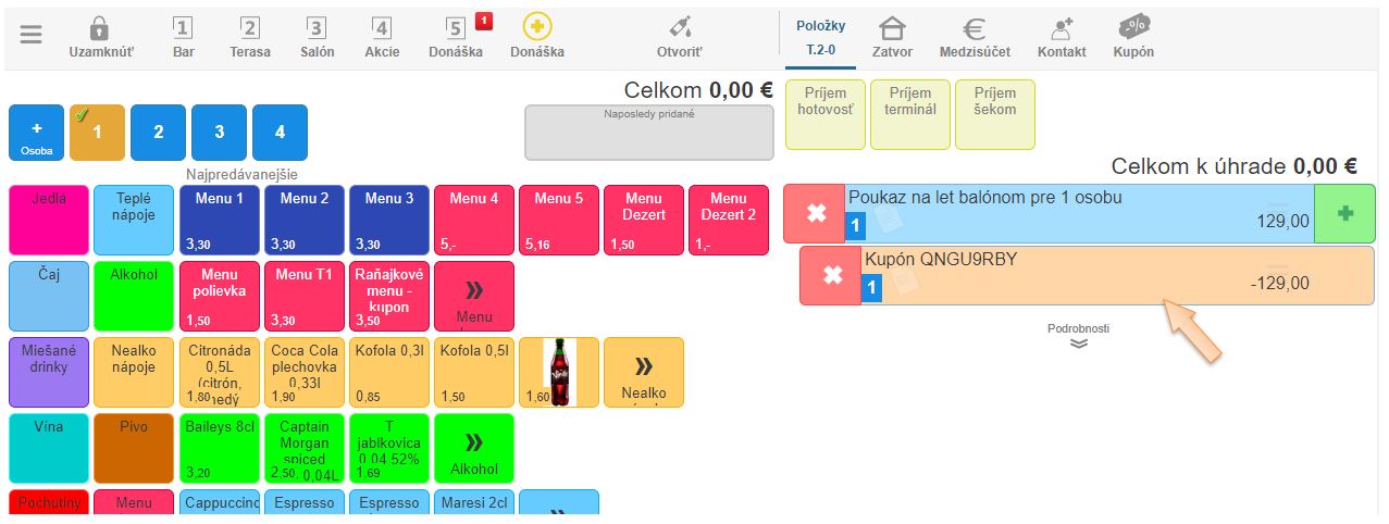 - Do predaja sa automaticky pridá služba / tovar naviazaná na daný kupón a kupón, ktorého hodnota sa automaticky odpočíta z celkovej ceny.