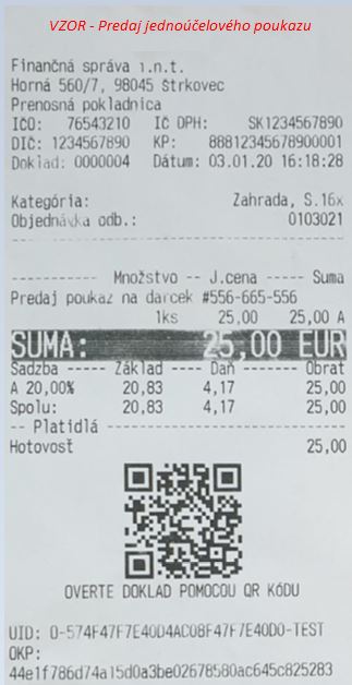 Vzorové doklady o predaji a následnom čerpaní jednoúčelového poukazu s vyobrazením čísla poukazu. (Napr. zariadenie FiskalPro tlačí číslo ako sériové a pod.)