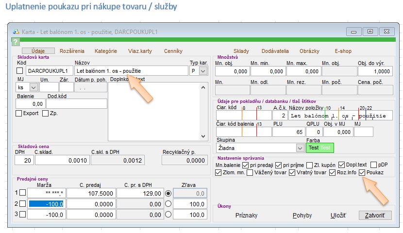 - Bežne predajný tovar / služba - druhá karta pre daný tovar / službu, ktorá môže byť predávaná samostatne, alebo môže byť na ňu uplatnený poukaz.