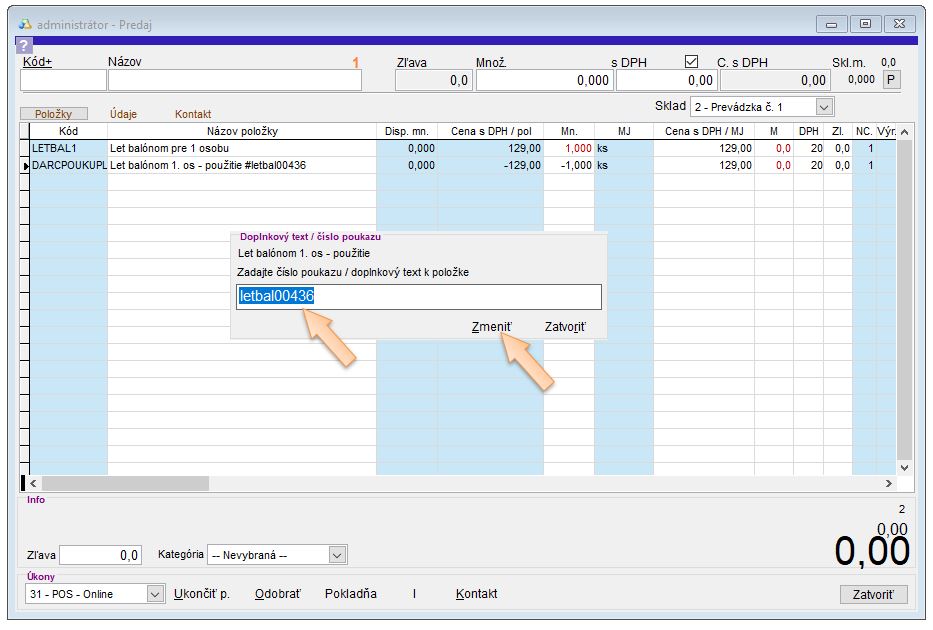 - Zadajte číslo - identifikátor poukazu a kliknite na tlačidlo Zmeniť. (Dvojklikom na položku v zozname je možné číslo dodatočne zmeniť. Ak používate skener, je možné číslo na poukážke naskenovať.)