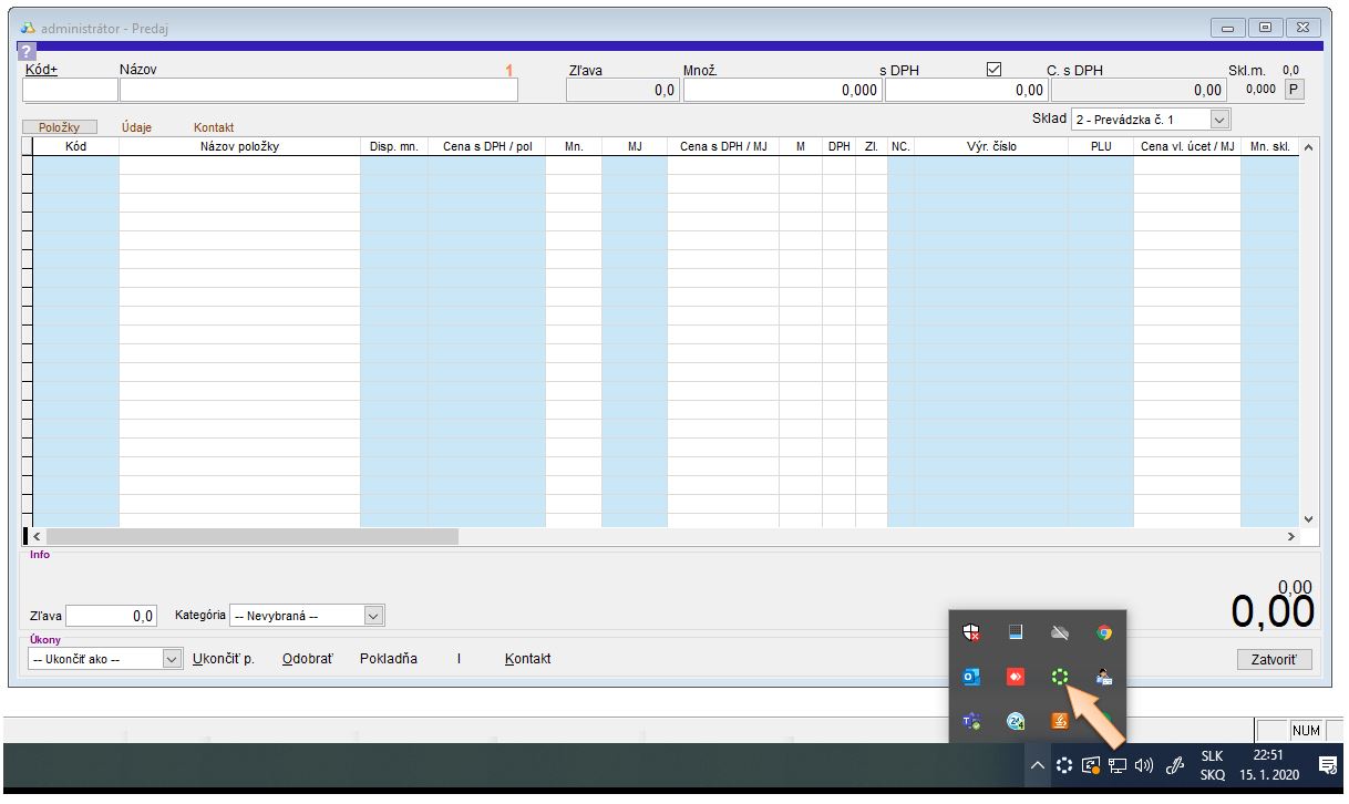 - Po spustení sa v pravom dolnom rohu pri hodinách zobrazí zelená ikona aplikácie POS Manažér.