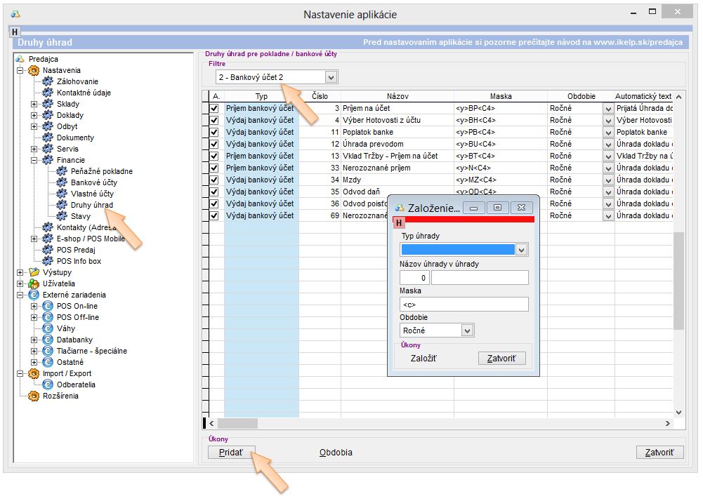 • Kliknutím na úkon Založiť sa vytvorí nový typ úhrady v danom účte.