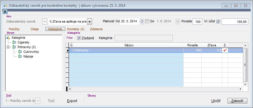 - V záložke Kategórie nadefinujte konkrétnej skladovej kategórii percentuálnu zľavu. V tomto prípade bude percentuálna zľava aplikovaná na všetky položky z danej kategórie..