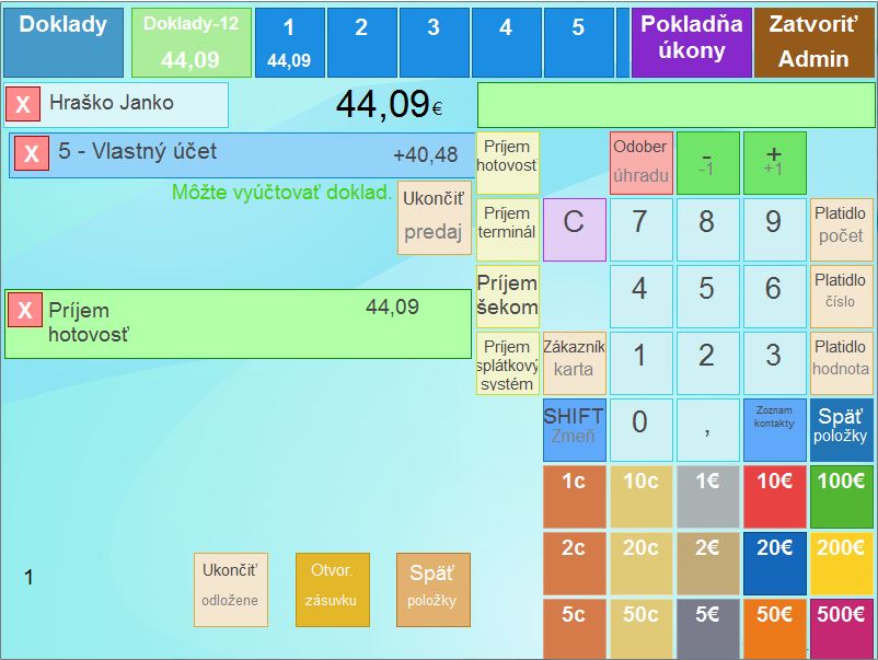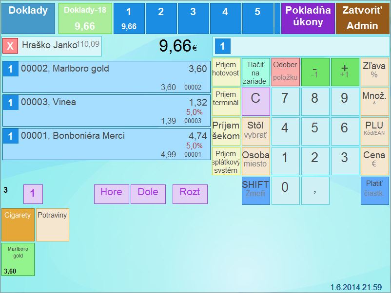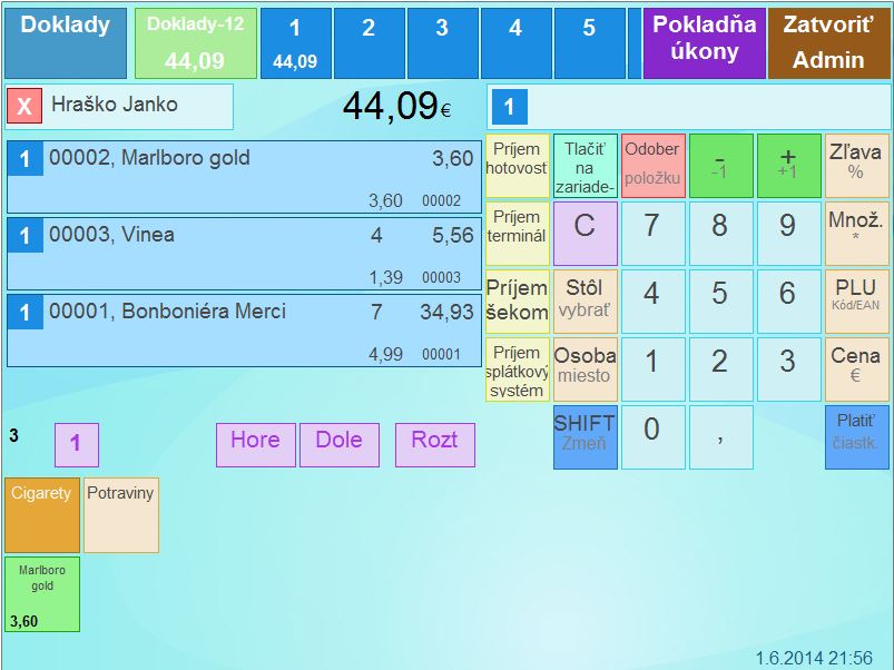- Naúčtujte zákazníkovi tovar ktorý si u Vás zakúpil a vyúčtujte doklad. (Na priloženom obrázku je vidieť, že za cigarety sa kredit do vlastného účtu nepripísal, čo je správne podľa nadefinovaného cenníka.)