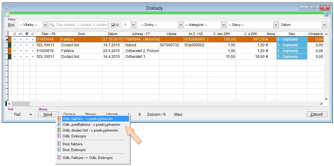 - Následne si vyberte požadovaný druh dokladu, ktorý si prajete z existujúceho vytvoriť.