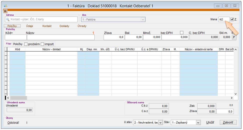 - Vyberte požadovanú menu v ktorej bude doklad vystavovaný.