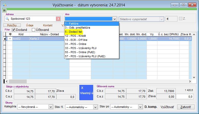 2. Vytvorenie "Dodacieho listu" z odbytového dokladu (Odberateľskej objednávky, Zákazky, Odb. ponuky a pod). Označte daný odbytový doklad v zozname dokladov a kliknite na tlačidlo Vyúčtovať. Následne vyberte z ponuky "Ako" možnosť vyúčtovania na Dodací list.