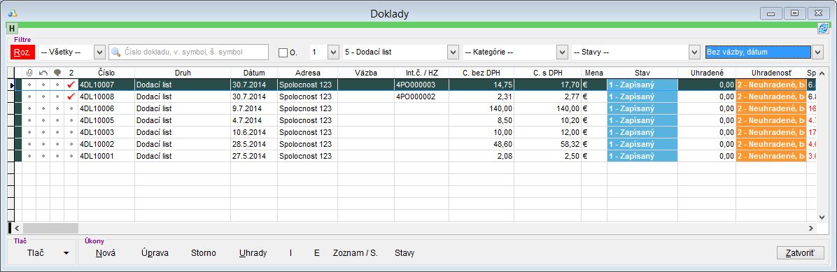 3. Pomocou filtra "Dátum", je možné vyfiltrovať dodacie listy, ktoré ešte nemajú väzbu na žiadny doklad (hotovostný doklad, faktúru). (Takto Vám neunikne žiadny doklad z evidencie a máte tak prehľad o tom, čo ešte zákazníkovi nebolo účtované.)