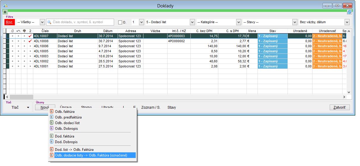 Táto situácia môže vzniknúť vtedy, ak Vašim zákazníkom priebežne vytvárate dodacie listy, na základe ktorých dodávate tovar. Následne dodacie listy zákazníkovi účtujete. Dodací list je možné vyúčtovať na faktúru, vtedy vznikne jeden dodací list a k nemu je naviazaná jedna faktúra, prípadne môžete dodací list vyúčtovať v hotovosti na fiskálnej tlačiarni (viac o tejto možnosti sa dočítate v návode Predaj - ukončenie predaja) alebo môžete vytvoriť zbernú faktúru, na ktorú bude naviazaných viacero vytvorených dodacích listov.