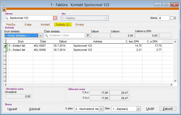 6. Otvorí sa formulár novo vytvorenej faktúry, kde je možné v záložke Doklady vidiet jednotlivé dodacie listy a ich počet naviazaných na danú faktúru. (Samotné položky na doklade nie sú zobrazené, pretože sa nachádzajú na jednotlivých dodacích listoch a zberná faktúra slúži na vyúčtovanie týchto dokladov.)