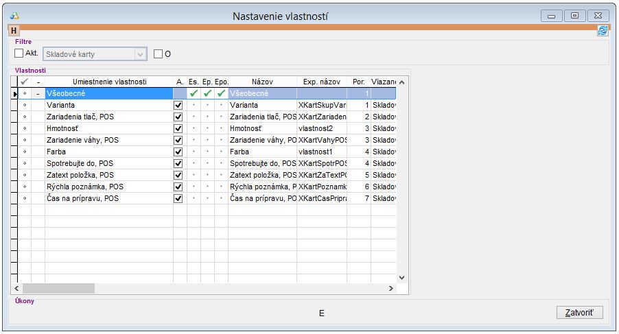 Po zadaní užívateľských vlastností je možné v časti Nastavenia -> Sklady -> Karty nadefinovať, pomocou ktorých vlastností bude možné filtrovať karty priamo v zozname skladových kariet. (V zozname skladových kariet je možné nadefinovať 5 vlastností, pomocou ktorých bude následne možné karty filtrovať)