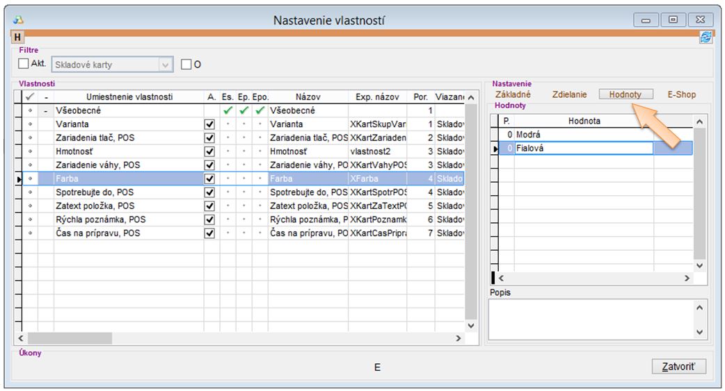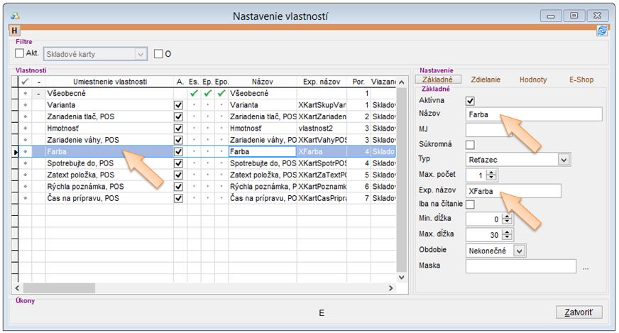 V nastaveniach aplikácie v časti Užívateľské vlastnosti, je možné doplniť jednotlivé vlastnosti. V záložke Základné je potrebné nastaviť základné údaje, prípadne v záložke Hodnoty vyplniť hodnoty danej vlastnosti. (Tieto hodnoty sa automaticky zakladajú aj importom.)k