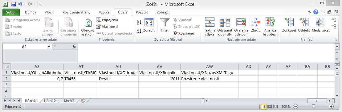 • Vyplniť správne hlavičku v pripravenom CSV súbore aby sa importované údaje správne spárovali. (napr. Vlastnosti/XRocnik, Vlastnosti/XOdroda. V prípade, že jedna vlastnoť má viacero hodnôt, tieto sa pridávajú v tvare Vlastnosti/XOdroda[1], Vlastnosti/XOdroda[2].)