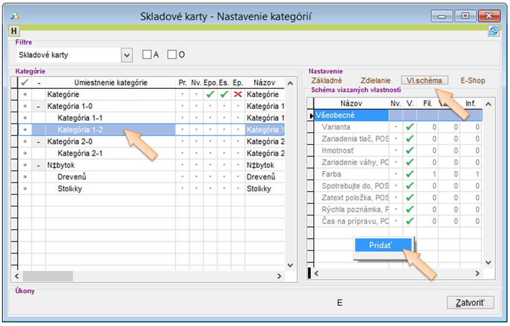 • Priradiť vytvorené vlastnosti konkrétnej kategórii. Vlastnosti je možné definovať konkrétnej kategórii, pretože v rôznych kategóriach zvyčajne bývajú rôzne vlastnosti. (Vlastnosti sa kategóriam definujú v časti Nastavenia -> Kategórie. Kliknutím na konkrétnu kategóriu je možné v záložke Vl. schéma kliknutím pravým tlačidlom myši vytvorenú vlastnosť priradiť danej kategórii.)