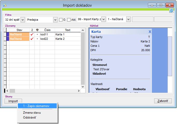 Nastavenia pre import skladovych kariet