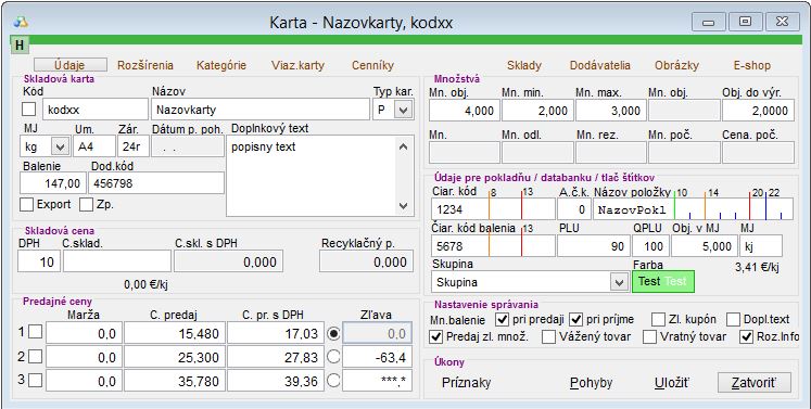 Vlastnosti/Kod kodxx Údaje/Kód Kód skladovej karty