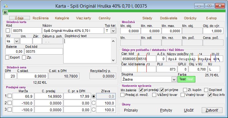 Pozor, ak údaje "Objem" a "Obsahu alkoholu" zo záložky Rozšírenia nebudú vyplnené, daná karta sa nezapočíta do výkazu alkoholu! Preto je potrebné ich zadať na všetkých skladových kartách, ktoré vstupujú do výkazu alkoholu. (Pozor napríklad víno do alkoholu z pohľadu výkazov nespadá, takže Cinzano sem nepatrí). Tieto hodnoty uvádzajte správne, nakoľko ich zlé uvedenie má za následok nesprávne vypočítané hodnoty na výkaze alkoholu. Neskoršie zistenie tejto chyby vyžaduje pracné opravy.