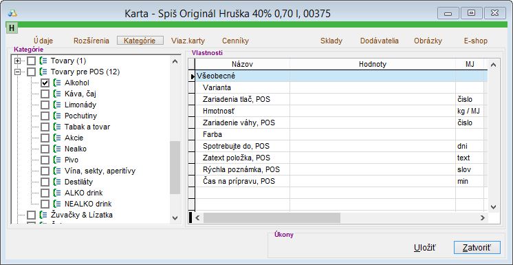 Pre presnejšiu evidenciu je vhodné zaradiť tovar do nejakej kategórie. Odporúčame si vytvoriť samostatnú kategóriu Alkohol, do ktorej si zaraďte všetky skladové karty, ktoré vstupujú do výpočtu alkoholu. Túto kategóriu je možné využívať pri hromadnom výbere skladových kariet do inventúry pri inventovaní skladových zásob alkoholu, dá sa použiť aj pre výpočty evidencie alkoholu a pri kontrole a konfrontácii so skladovými pohybmi.