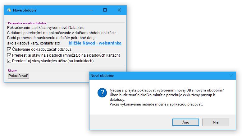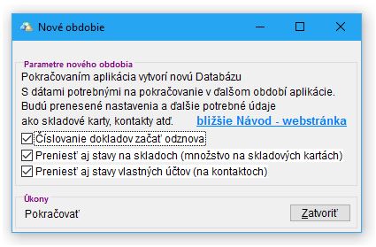 - Zobrazí sa okno pre vytvorenie nového obdobia v aplikácii. Z ponuky vyberte, ktoré údaje si prajete preniesť do novej databázy. Odporúčame v tomto prípade označiť len možnost 1. Počiatočné stavy na sklade budú nahodené už na základe reálnej príjemky, alebo inventúry už v novej databáze.