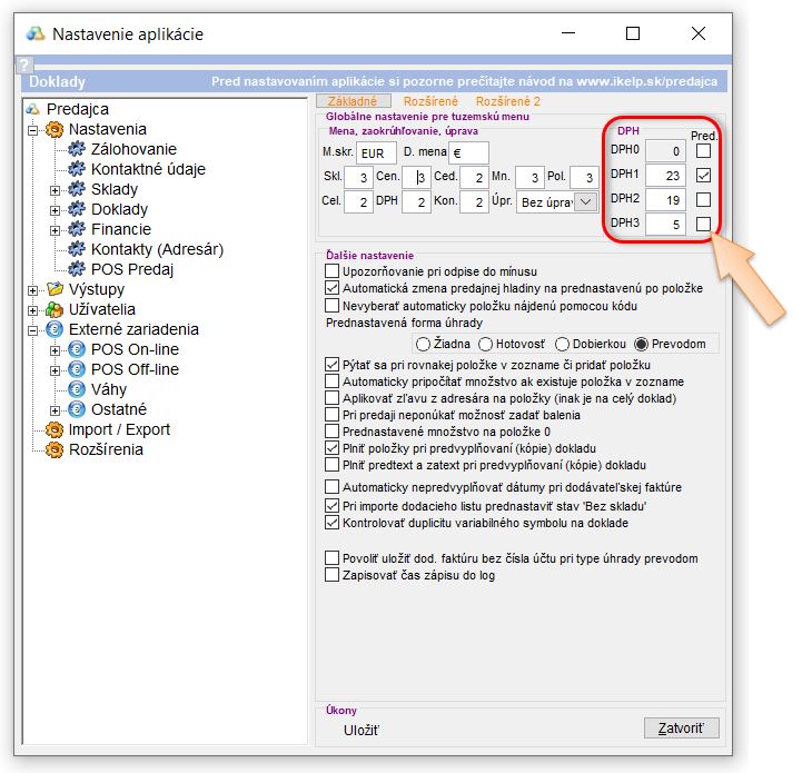 - V časti DPH vykonajte úpravu základných sadzieb DPH.