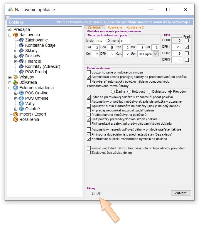 Jednotlivé ceny, ako aj nastavenia skladových kariet sú na pokladňu posielané priamo z cloudovej databázy. Preto aj v tomto prípade bude potrebné následne po zmene nastavení na kartách v cloudovej databáze, aktualizácii aplikácie na predajni a upravení základných sadzieb DPH na pokladni zosynchronizovať zmeny z databázy iKelp Cloud.