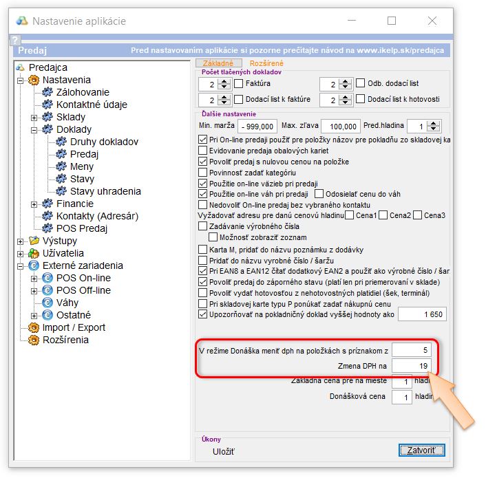 4. Pre nastavenie Zmena DPH na definujte na ktorú DPH sa má základná DPH meniť. (V našom prípade 19%.)