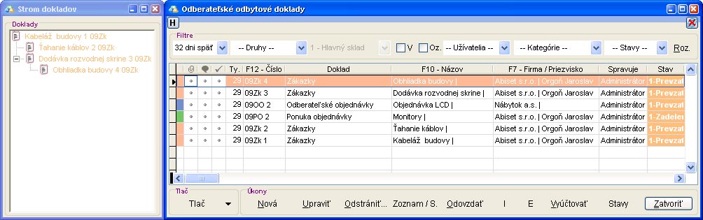 Takýmto spôsobom sa dá vytvoriť strom, kde jednotlivé doklady spadajú pod nadradené doklady. Tento strom je možné zobraziť po kliknutím pravým tlačidlom na niektorý z dokladov a následným kliknutím ľavým tlačidlom na možnosť Strom. Odporúčame si usporiadať okná podľa nasledujúceho obrázka pre jednoduchšiu orientáciu. Po kliknutí na niektorý doklad sa v danom strome zobrazí kompletný strom, do ktorého spadá aj tento označený doklad.