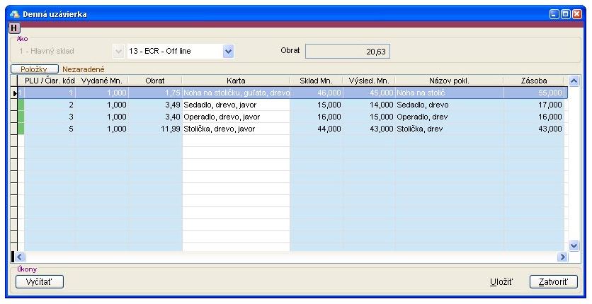 6. Po úspešnom vyčítaní sa v tabuľke v záložke Položky zobrazia všetky predané položky s množstvami a celkovým obratom za položku. V hornej časti okna, nad tabuľkou, je vidieť celkový obrat za daný deň. Tento údaj môžete porovnať s dennou uzávierkou na pokladni.